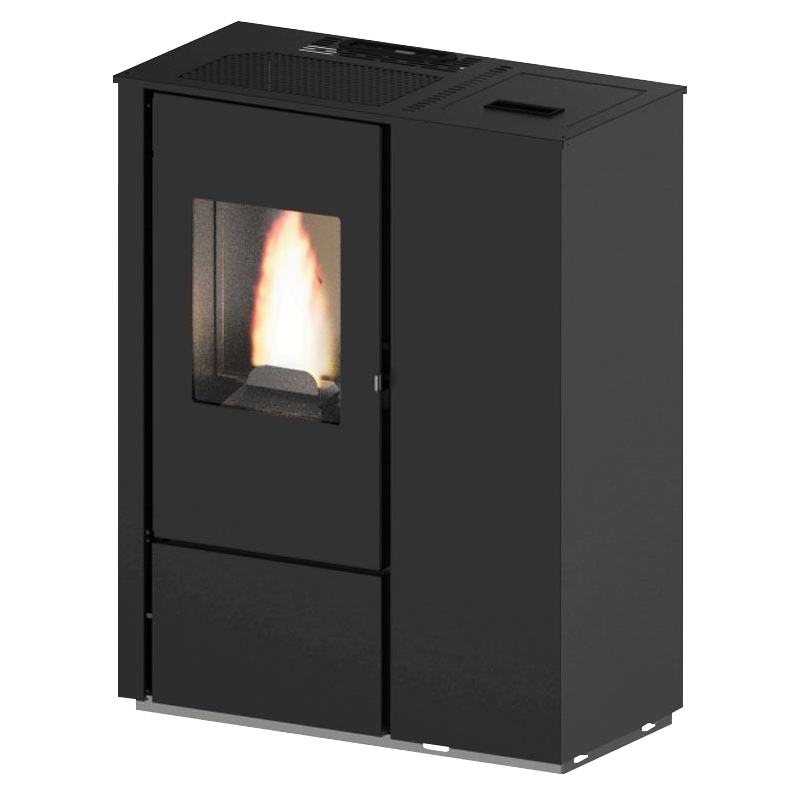Eva Calor Carmen Slim, 7 kW, is a compact pellet fireplace with a small depth (only 30 cm), which is designed for heating rooms with a volume of up to 180 m3, depending on the insulation of the room. Rear flue outlet (it is possible to modify the fireplace for flue gas outlet through the side), pellet feed from above.