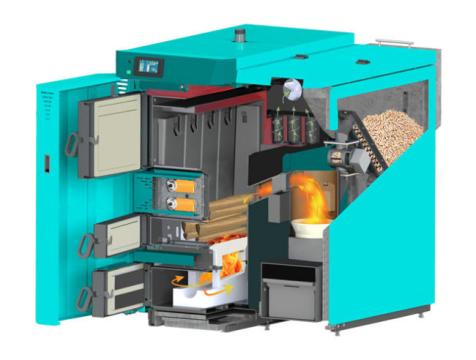 Centrometal BIO TEC PLUS 25-45KW ir jaunās paaudzes centrālapkures katli ar divām sadegšanas kamerām – granulām un koksnei.