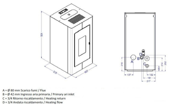 Kamīna izmērus un pieslēguma vietas iespējams skatīt attēlā, centrālapkures pieslēguma izmēri: 3/4''.