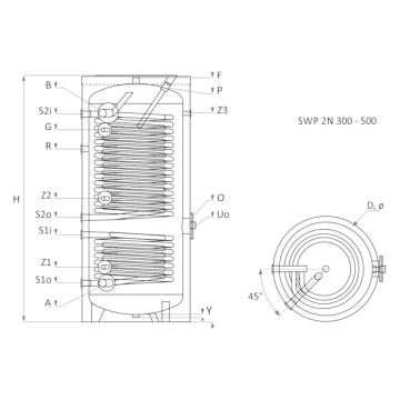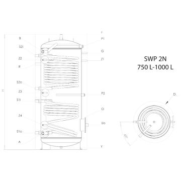 Karstā ūdens tvertne SWP-2N, ar diviem plašas platības siltummaiņiem. Tas ļauj pieslēgt zemas temperatūras apkures avotu, kā piemēram siltumsūkni apvienojumā ar citu apkures avotu (piemēram, saules kolektoru sistēmu).