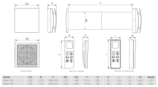 - Viena iekārta nodrošina gaisa apmaiņu no 20 līdz 60 m3/h – telpām no 22 līdz 50 m2 (attiecīgi Orion 100 un 150);