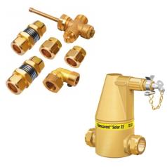 Aksesuāri un montāžas materiāli saules kolektoru sistēmas montāžai, apkopei un palaišanai - siltumnesēji, sūkņu grupas, temperatūras sensori, izplešanās tvertnes, vadības bloku, tērauda caurules un to savienojošie elementi, kā arī jumta pārejas elementi saules kolektoru sistēmas pārvadei caur jumtu uz saimniecības telpu.